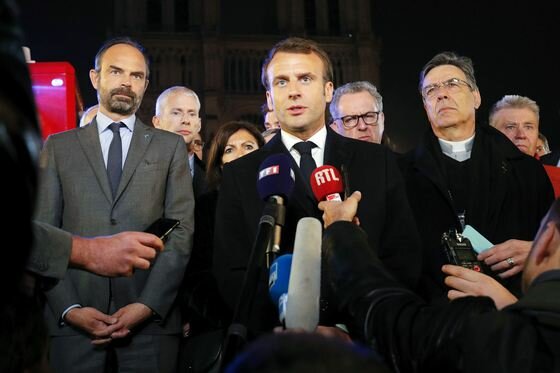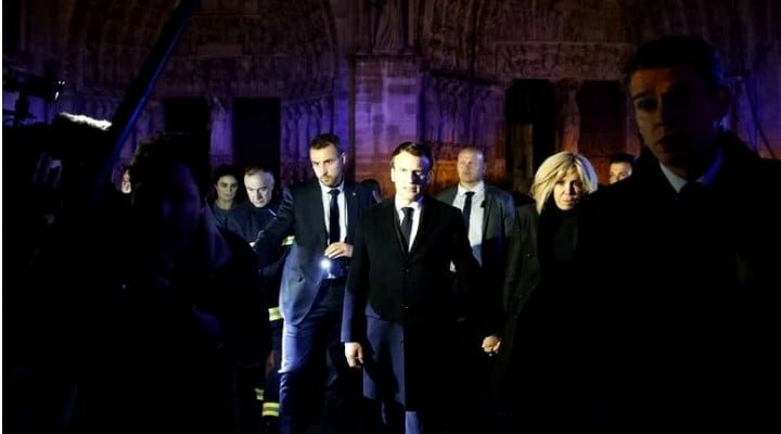Deja în noapte, obiectivele camerelor l-au surprins în preajmă pe Emmanuel Macron, președintele Franței. Împreună cu el era prim-ministru Eduard Filip, aproape întreg Guvernul. Macron și-a anulat participarea la o emisiune televizată. Trebuia să tragă concluziile marii dezbateri naționale, inițiată de el pe marginea valului de proteste ale „vestelor galbene”. Deplasându-se la Catedrala cuprinsă de flăcări Macron a arătat că ceea ce se întâmplă este punctul zero al interesului național și că misiunea lui primordială ca șef de stat era să încurajeze cei peste 400 de pompieri angajați în lupta riscantă cu focul.